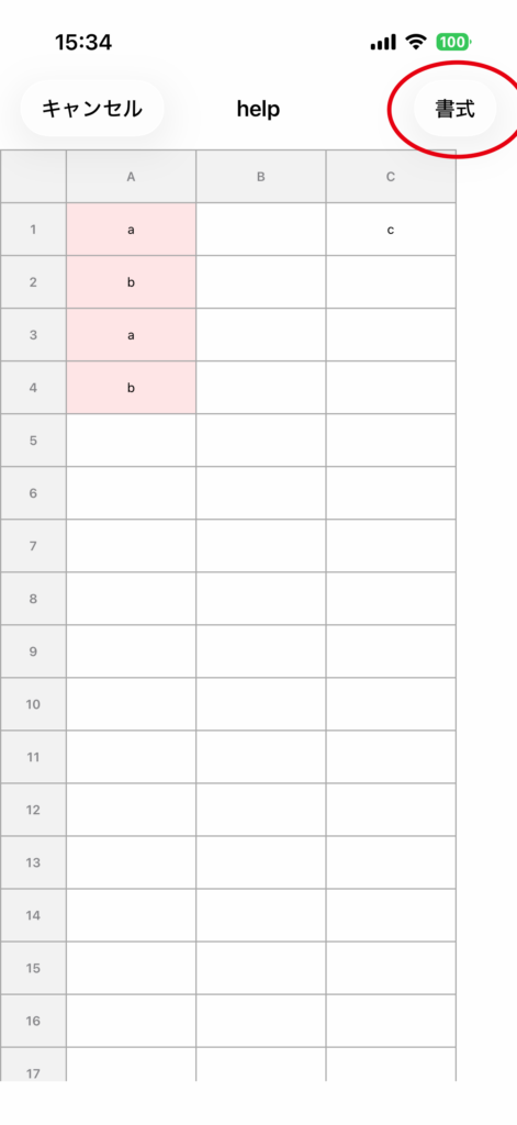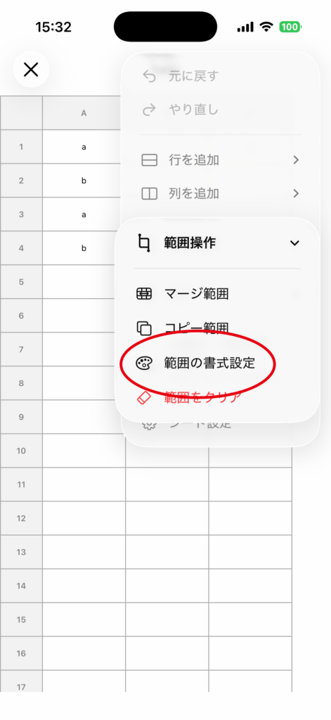 右上の 書式 をタップして、範囲書式設定画面に進みます。