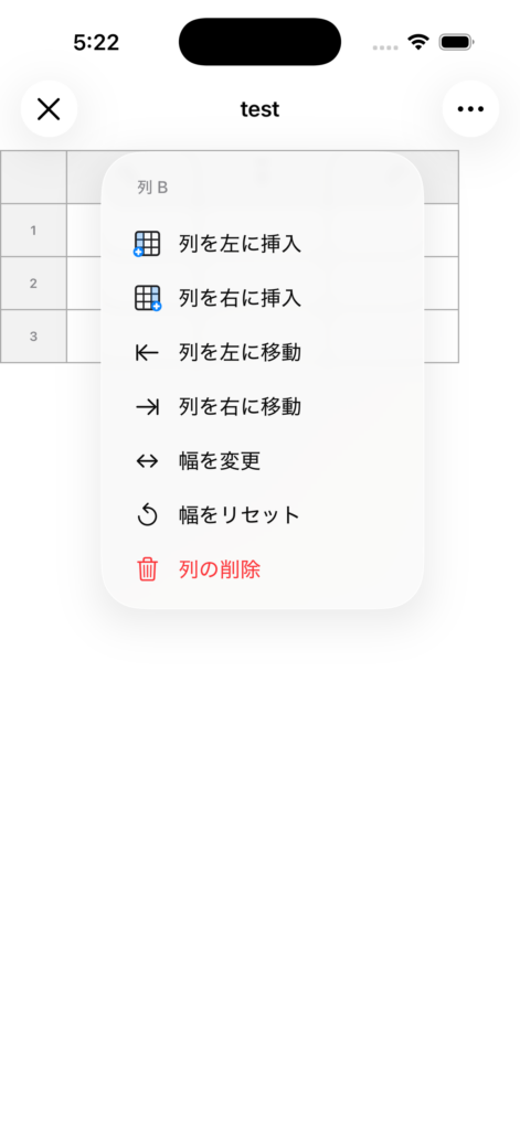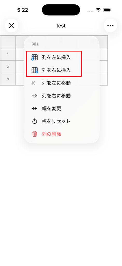 追加したい位置に近い列見出し(A, B, C…)を長押しして、メニューを開きます。